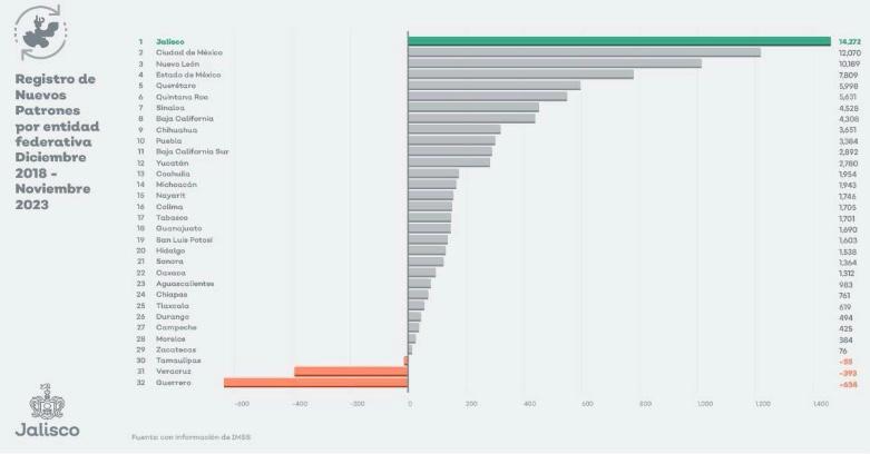 Con 14 mil 272 nuevos patrones o responsables de empresas, registrados durante actual gestión estatal, Jalisco, se posiciona en primer lugar nacional por este rubro, redundando en la creación de casi 94 mil empleos hasta noviembre de este pasado 2023, confirma el Instituto Mexicano del Seguro Social, al ratificar el listado de incorporaciones, que está por encima de la Ciudad de México y Nuevo León, que suman 12 mil 070 y diez mil 189, respectivamente.