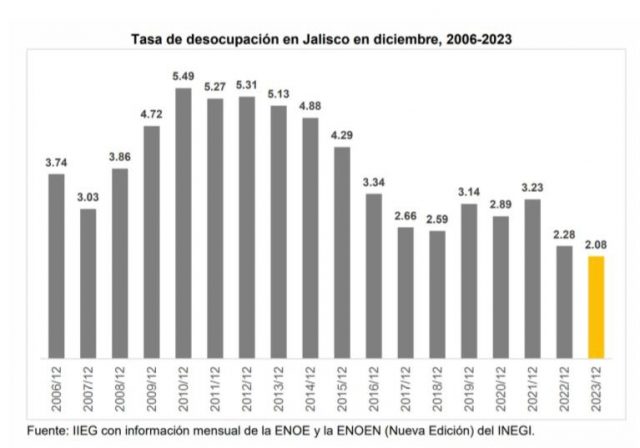 Luego que la tasa de desocupación durante diciembre de 2023 en Jalisco, se ubicó en 2.08 por ciento, menor a la registrada en noviembre, con 2.23 respectivamente, queda de manifiesto que es la más baja para un último mes anual, desde 2006, confirma, tras diagnóstico económico, el Instituto de Información Estadística y Geográfica, IIEG.