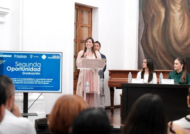 A propósito de presidir la conclusión de cursos de capacitación laboral, impartidos por la Academia Turística de Jalisco, en temas de hotelería, atención de calidad en el rubro restaurantero y de experiencias astroturismo a 67 mujeres trabajadoras en pueblos mágicos como Tlaquepaque, Lagos de Moreno, Tequila y Mazamitla, afirma que se vinculó esta acción, al programa “Segunda Oportunidad de ONU Mujeres” que busca asegurar la empleabilidad y crecimiento femenino en el sector turístico local.