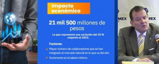 Reseña que esta elevada dotación del aguinaldo, se debe al incremento en el número de colaboradores o trabajadores nuevos, integrados al mercado laboral formal en este año, así como el aumento del salario mínimo, que se traduce positivamente en la incorporación de más empleados en la producción general, lo que a su vez, podrá detonar una derrama económica tres veces mayor, es decir, llegar a los 63 mil millones de pesos.
