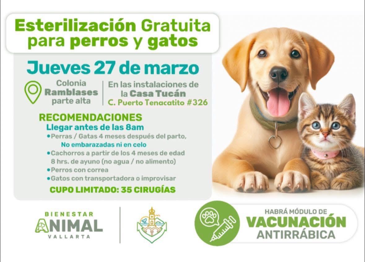 La Dirección de Bienestar Animal de Puerto Vallarta invita a la comunidad a participar en la Jornada de Esterilización Gratuita para perros y gatos, que se llevará a cabo este próximo jueves 27 de marzo en la Casa Tucán, ubicada en calle Puerto Tenacatito #326, en la Colonia Ramblases parte alta.