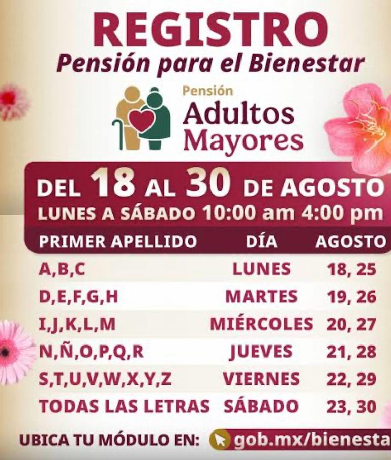 “…Invitamos a las personas adultas, mayores de 65 años, acudir a los módulos de Bienestar para realizar su registro de lunes a sábado de 10 de la mañana a cuatro de la tarde; el registro se realiza de acuerdo con la letra inicial del primer apellido, bajo el calendario publicado en nuestras redes sociales. Las personas adultas mayores, tienen la posibilidad de registrar una persona auxiliar que las represente en los trámites y debe presentar los mismos documentos…”