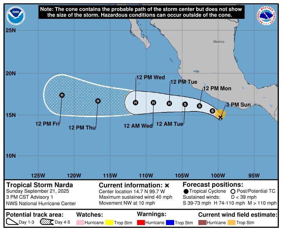 La tormenta tropical Narda se ha desarrollado en el océano Pacífico, localizada aproximadamente a 390 kilómetros al sur-sureste de Zihuatanejo, Guerrero. De acuerdo con el reporte meteorológico, mantiene un desplazamiento hacia el noroeste a 17 km/h, con vientos sostenidos de 65 km/h y rachas de hasta 75 km/h.