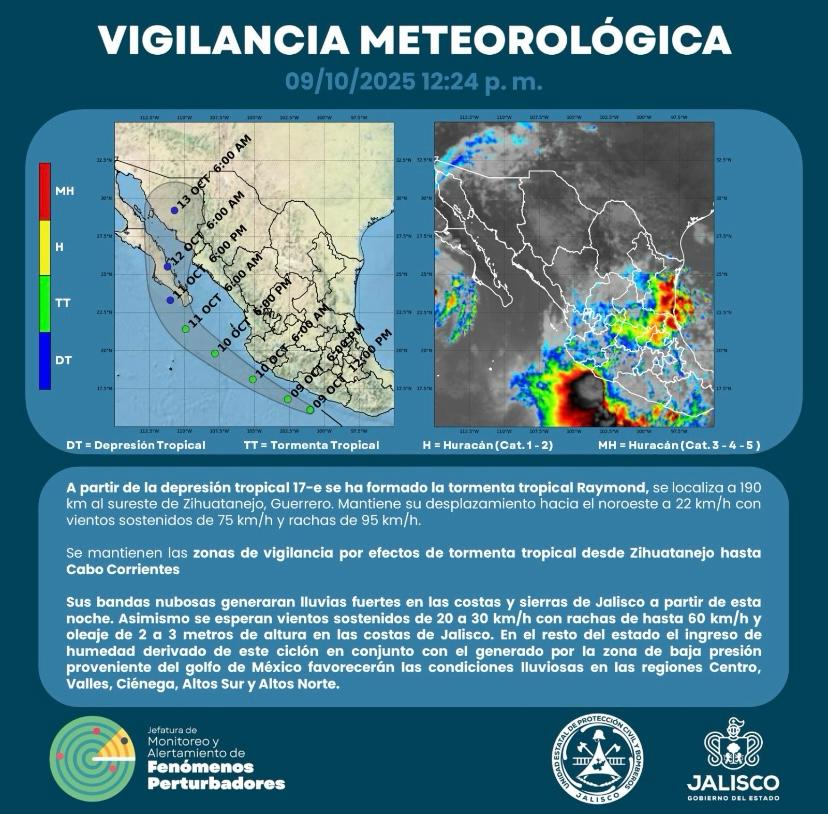 Como medida de prevención a posibles afectaciones, por presencia de la tormenta tropical Raymond, nueve municipios costeros de Jalisco, entre estos Puerto Vallarta, suspenden clases en todos sus planteles de enseñanza, este viernes 10 de octubre, anuncia la Secretaría de Educación Estatal, al enfatizar que tal medida, continuará hasta en tanto mejoren las condiciones meteorológicas.