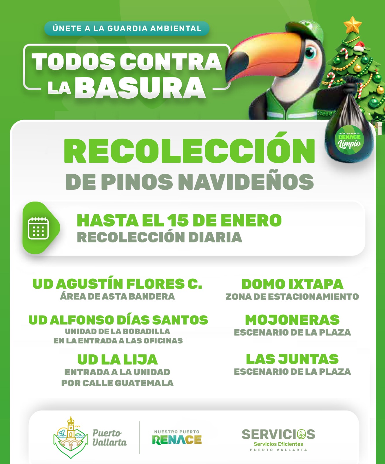 La Dirección de Servicios Eficientes, mantiene activo el programa de recolección de pinos navideños como parte de la estrategia “Todos contra la basura”, para promover el manejo adecuado de estos residuos tras la temporada decembrina.