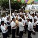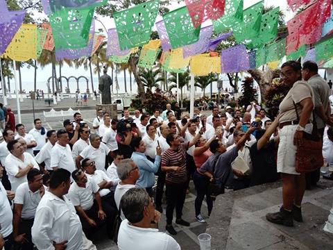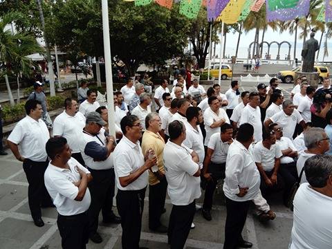 Aproximadamente 50 chóferes se concentraron en la plaza principal de Puerto Vallarta esperando instrucciones de sus líderes sindicales, Jaime Aguilar y Felipe Aréchiga.