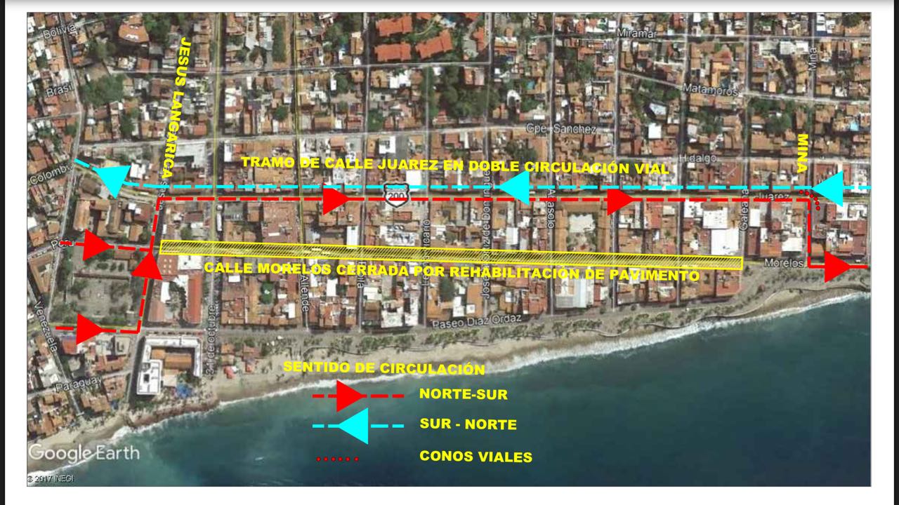 Durante este período, dicha vialidad (Morelos) será cerrada parcialmente al paso de vehículos, desde la calle Jesús Langarica (parque Hidalgo) hasta Mina, y se habilitará en doble sentido la circulación de la calle Juárez en el mismo tramo.